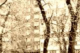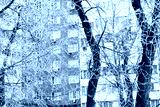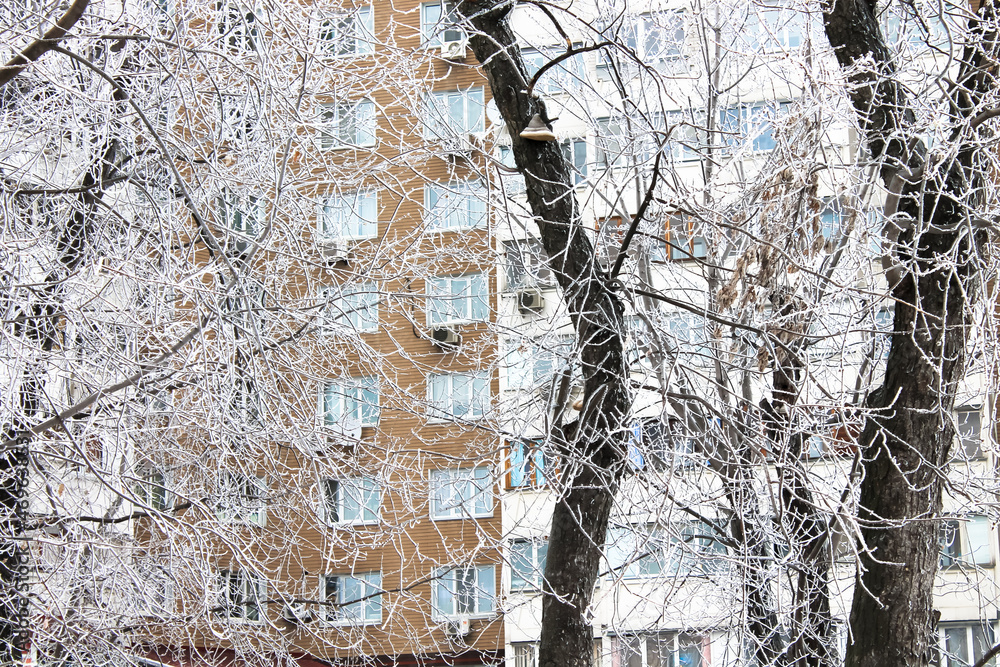 A multi-storey tree with bare branches covered with white snow on a snowy winter day. Windows in an apartment house, building in a big city, town. A frosty cold day in December, January, February.