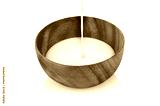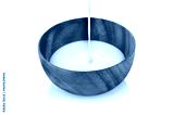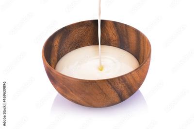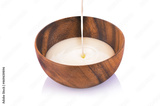 Yogurt poured into a wooden bowl isolated on white background. Close-up, straight line.