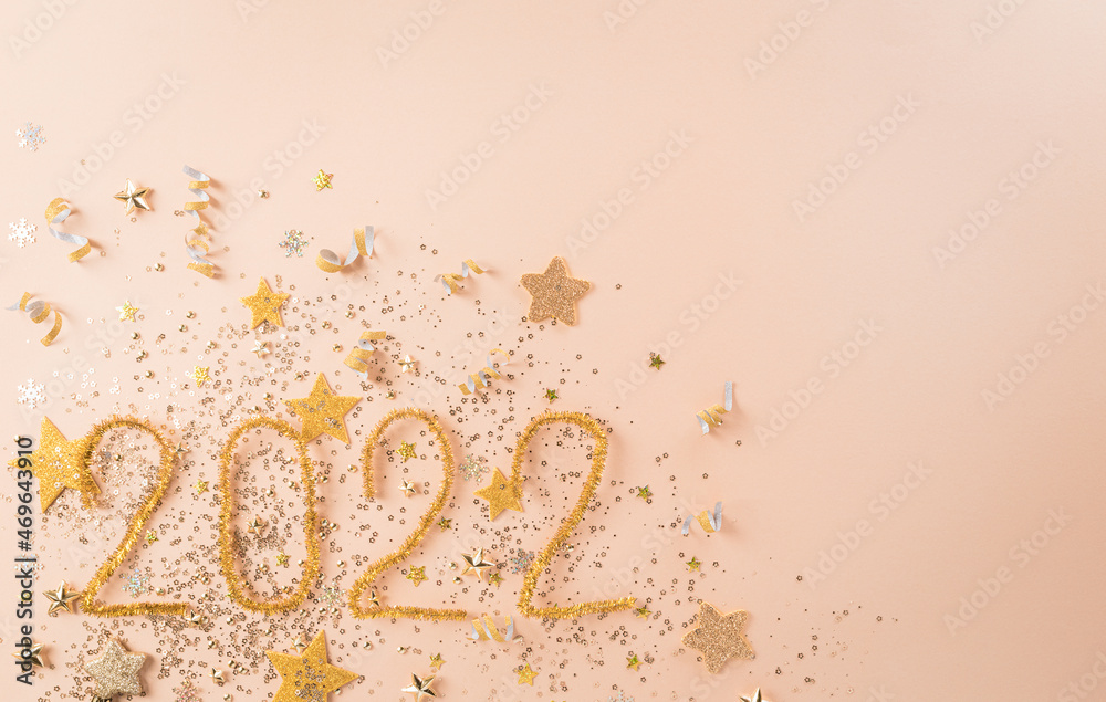 Happy new year celebration background concept made from golden christmas ball and star on pastel background.