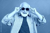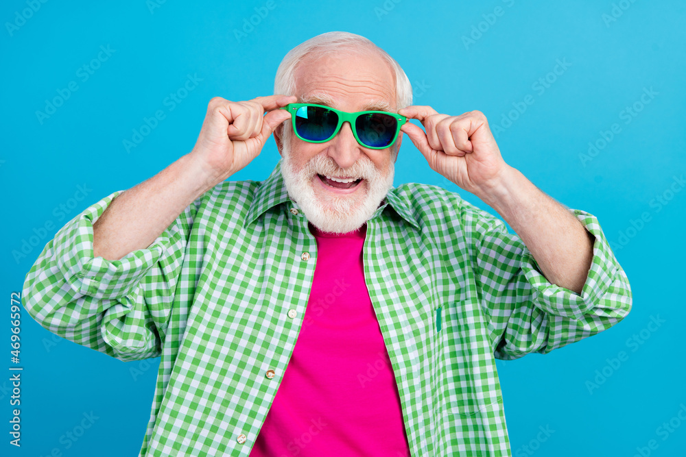 Photo of positive retired cheerful old grandparent wear cool sunglass enjoy summer isolated on blue color background