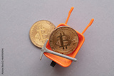 BItcoin crypto currency mining. Bitcoin gold coin with a mining pickaxe