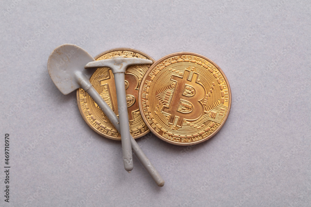 BItcoin crypto currency mining. Bitcoin gold coin with a mining pickaxe