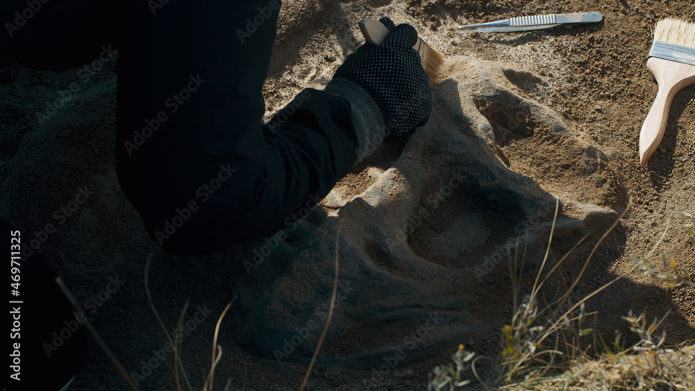 Crop archaeologist cleaning dinosaur skull from dust