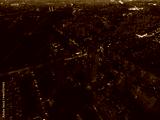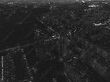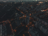 Aerial night city streets with lights illumination top flight in eastern Europe, Ukraine. Multistory buildings scenic dark contrast view. Industrial, urban moody background