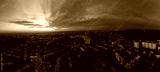 Aerial scenic vibrant sunset panorama wide view with epic skyscape. Kharkiv city center, Pavlove pole residential district streets and buildings in evening light