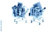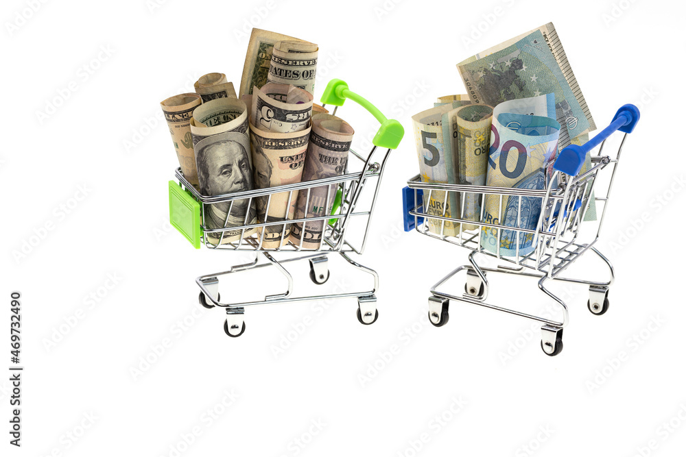 Close up macro view of two shopping carts filled with rolled dollar and euro bills. Sweden.
