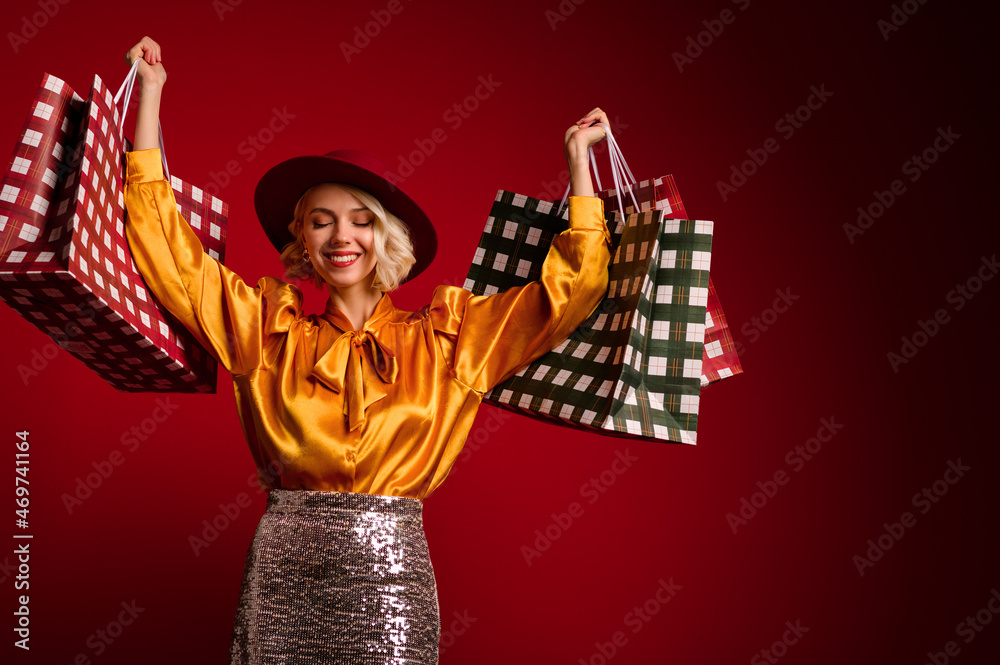 Happy smiling fashionable woman holding paper shopping bags posing on red background. Sale, Christmas purchase, Black Friday, discount, advertisement conception. Copy, empty space for text