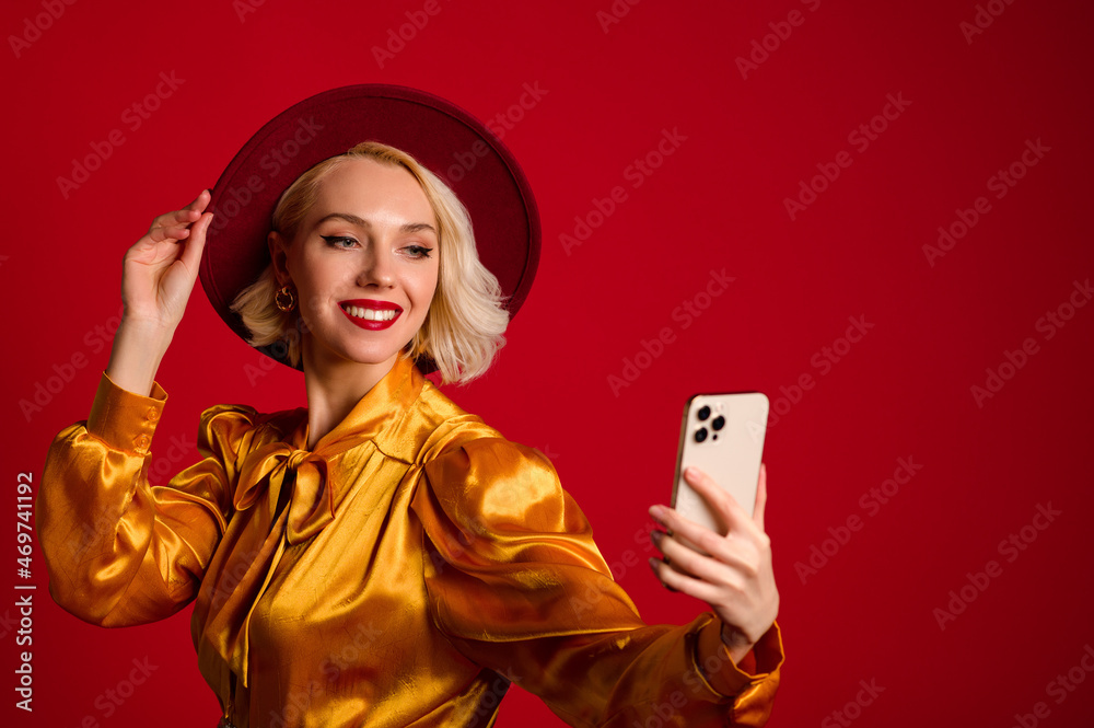 Happy smiling fashionable woman makes selfie, video message with her smartphone. Studio portrait, red background. Copy, empty space for text