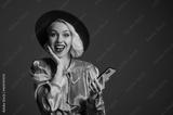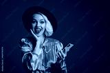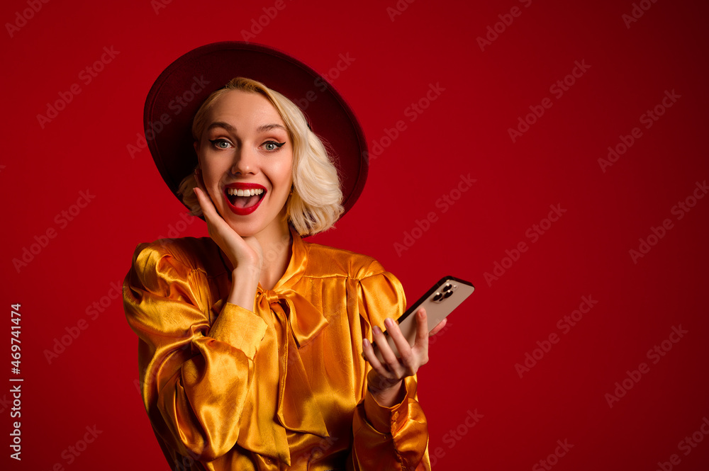 Excited, surprised happy smiling woman looks at camera, holding smartphone. Joyful expression. Online shopping, sale, discount, advertisement conception. Red background. Copy, empty space for text