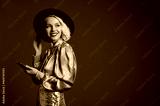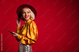 Happy smiling woman posing with phone, smartphone. Online shopping, using internet, social netwoks, advertisement conception. Red background, studio portrait. Copy, empty space for text