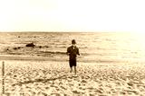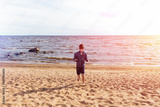 Happy boy in blue jacket and shorts barefooted running on sand on the beach under bright sunlight