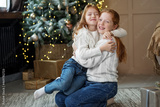 Two little sisters hug and laugh in the room. Winter holidays concept, merry christmas and family