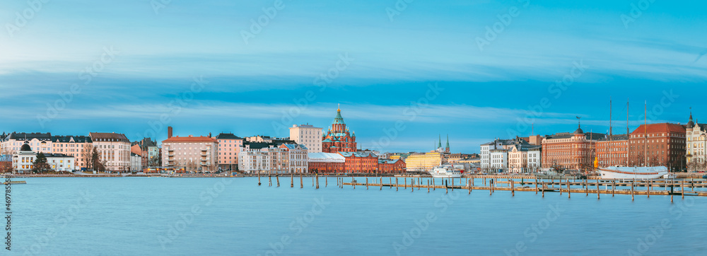 Helsinki, Finland. Panoramic View Of Kanavaranta Street With Uspenski Cathedral And Pohjoisranta Street In Winter Morning. Helsinki Cityscape Skyline