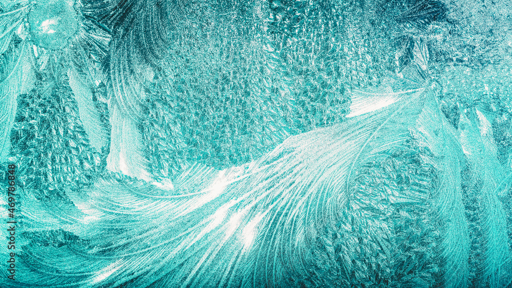 Blue Frosty Glass Ice Background, Natural Beautiful Snowflakes Frost Ice Pattern. Winter Xmas Christmas Abstract Backdrop, Background Or Texture. Turquoise Blue Colour.