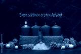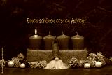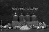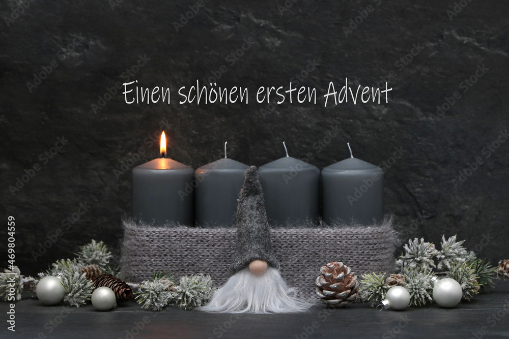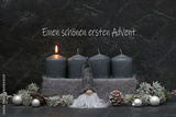 Adventsdekoration: Graue Kerzen mit Wichtel zum ersten Advent.