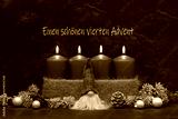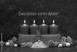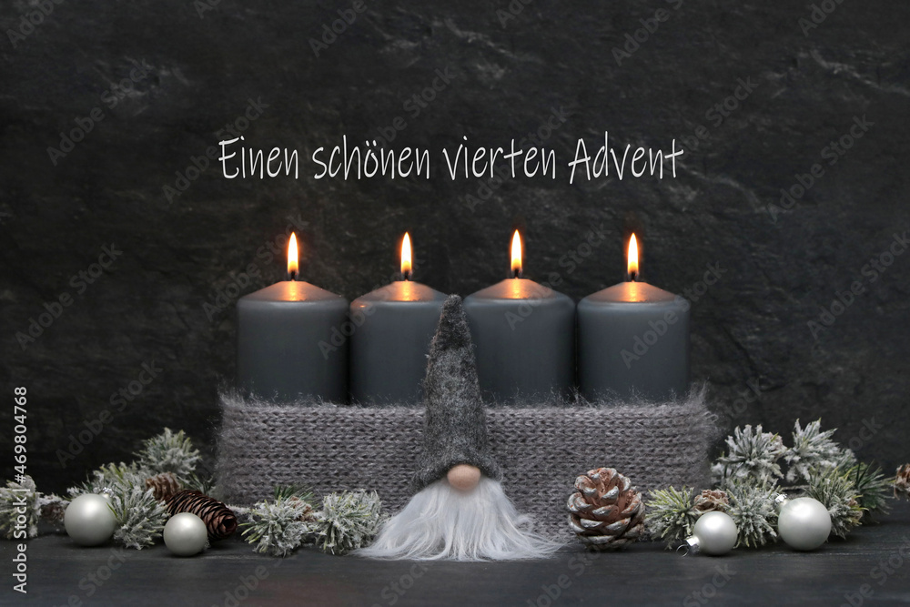 Adventsdekoration: Graue Kerzen mit Wichtel zum vierten Advent.