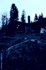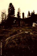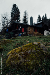 Großer moosiger Stein vor einer alter Waldhütte