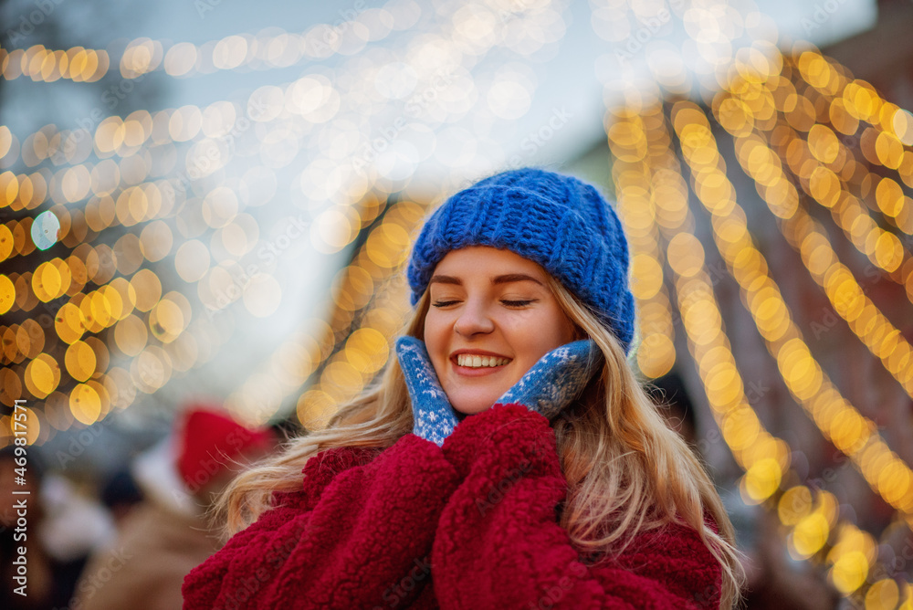 Christmas, New Year, winter holiday conception: happy smiling woman wearing knitted beanie hat, gloves, faux fur coat, posing in street. Copy, empty space for text