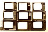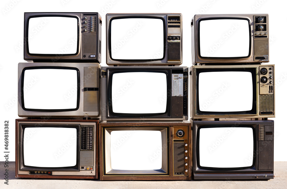 Pile of vintage televisions with cut out screen with clipping path isolated on white background.