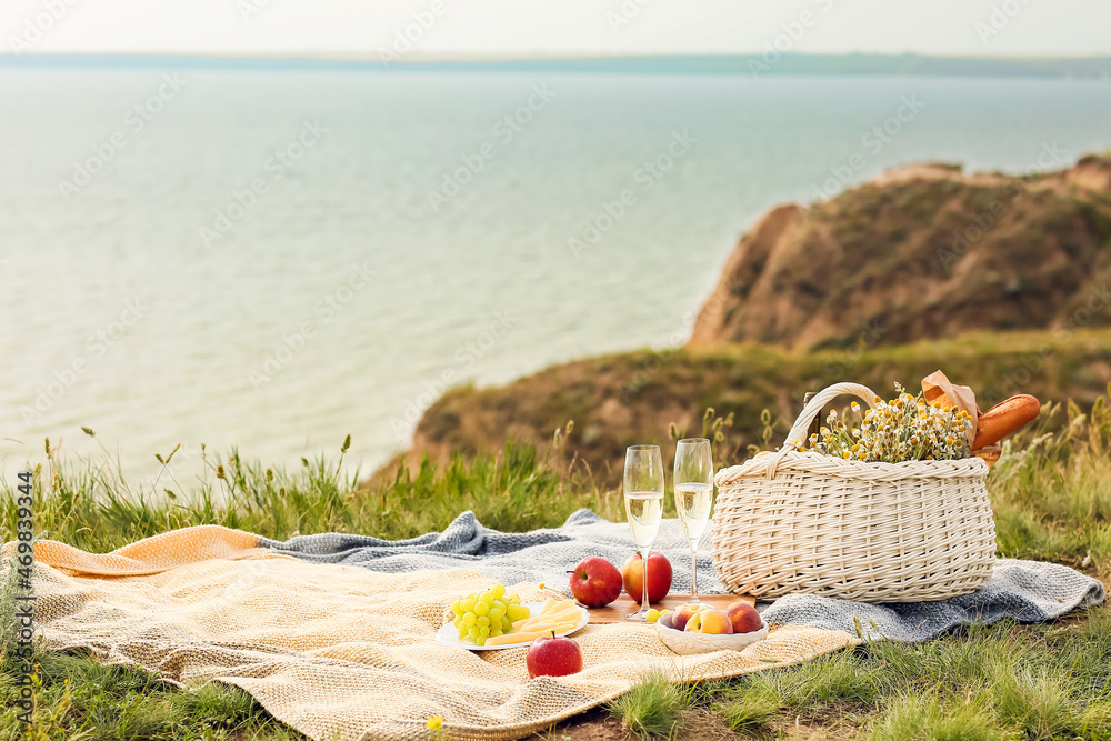 Wicker basket with tasty food and drink for romantic picnic in mountains near sea