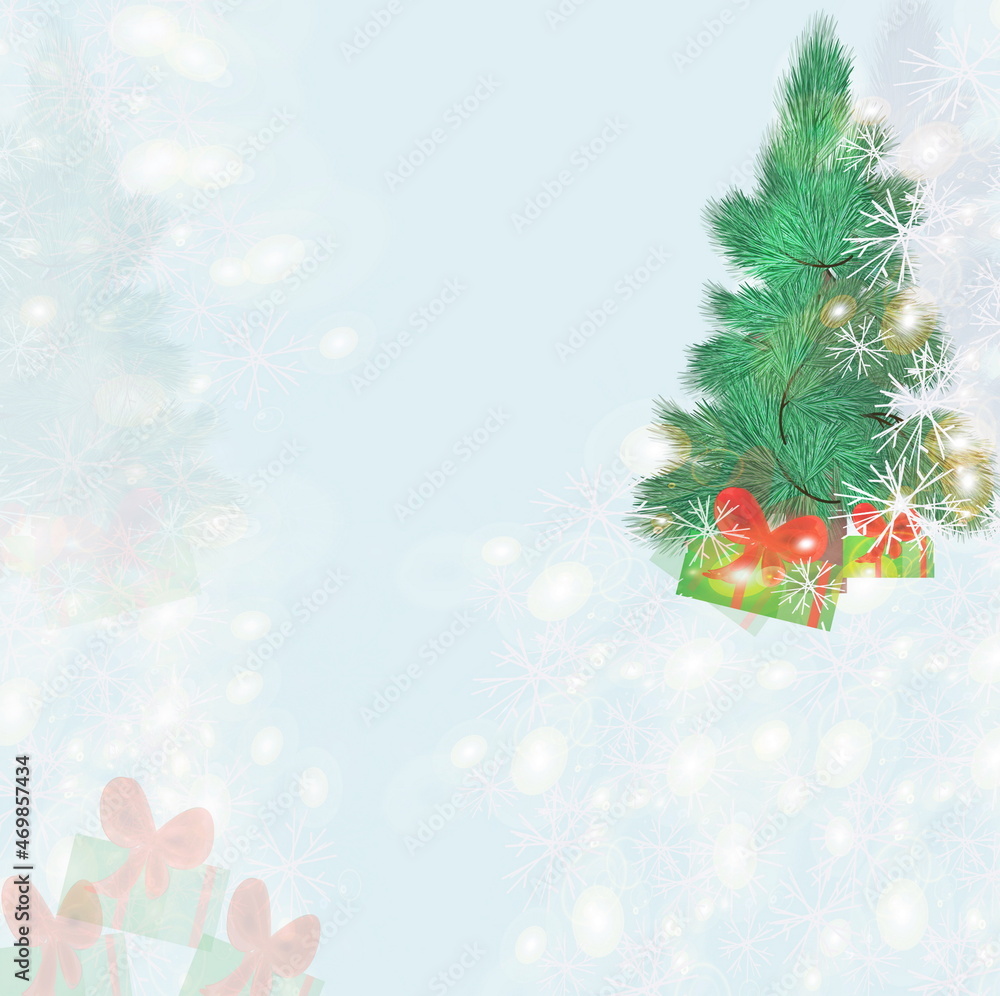 Christmas New Year Holiday background Invitation card with Fluffy Christmas tree and Gifts