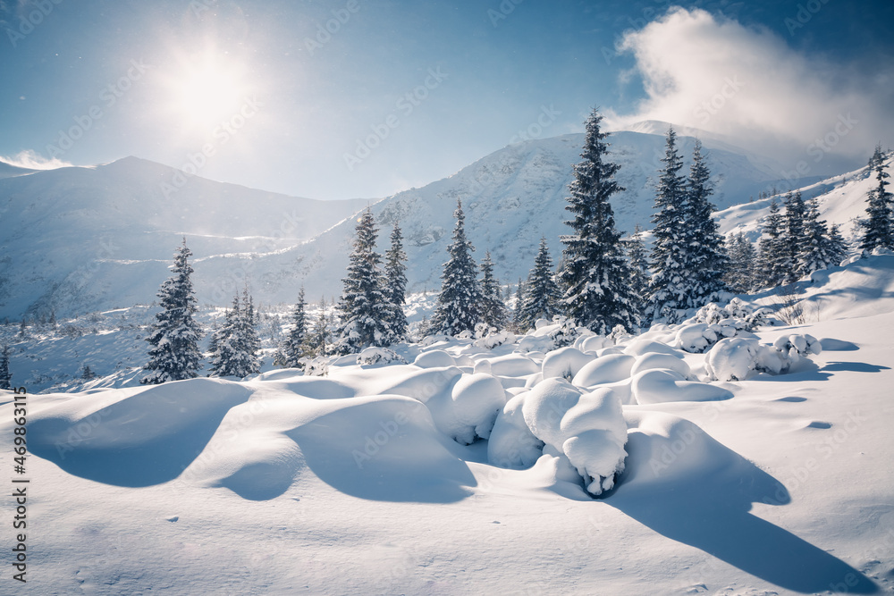 Fantastic snow-covered spruces on a frosty day. Carpathian mountains, Ukraine, Europe.
