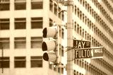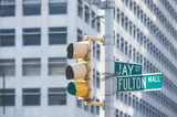 Traffic lights and road signs at Jay and Fulton Street, color toning applied, New York City, USA.