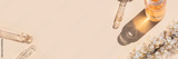 close up of pipette with liquid serum with golden bottle, shadows and cherry flowers