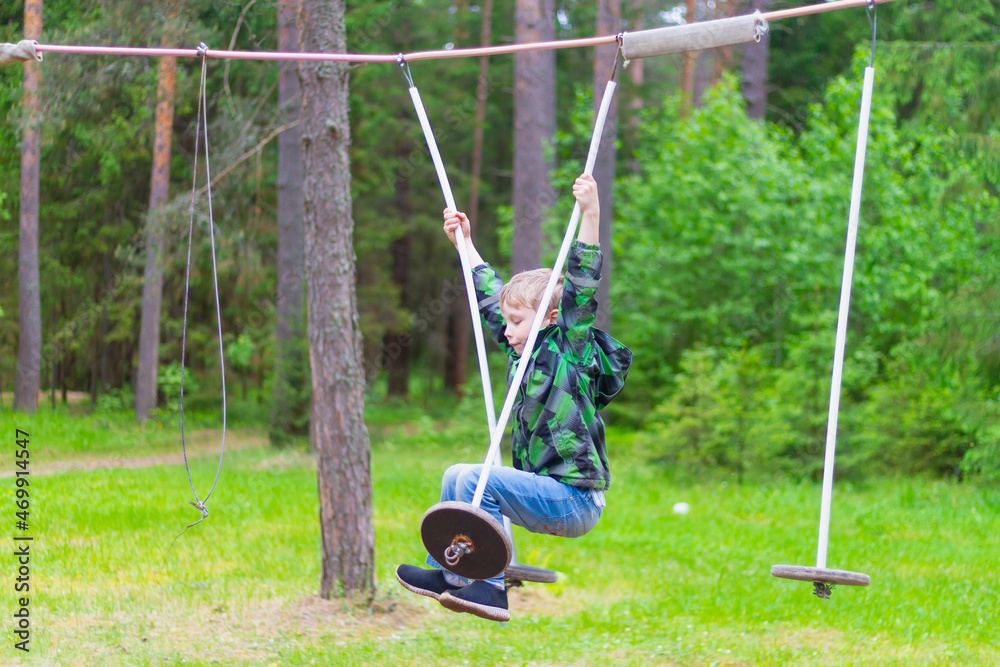 A boy overcomes a sports obstacle course in nature in the forest