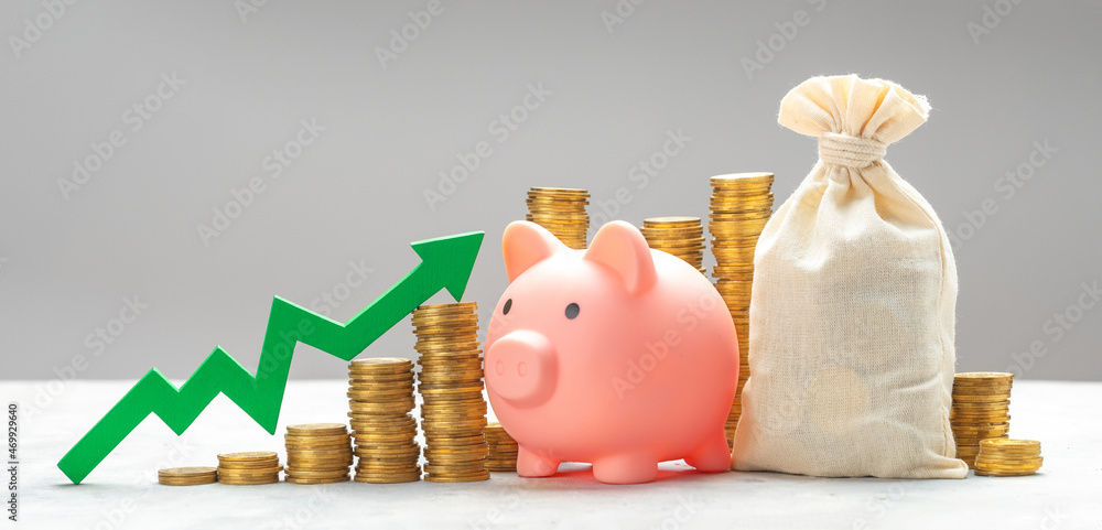 Savings growth. Koplika with a bag of money and a green up arrow and a bunch of coins