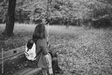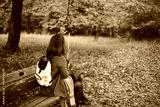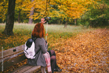 Girl taking photo with smartphone, colorful fall foliage on a bench in the park. Beautiful Autumn landscape background.