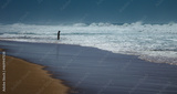 Silhouette of a girl walking in the water on a beach near a ocean.View of the large, foaming waves. Atlantic ocean. Portugal. Europe.