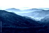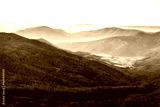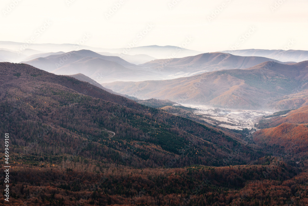 Beautiful landscape of autumn mountains layers range at hazy morning. A view of the misty slopes of the mountains in the distance and forest hills in rays of sunlight.Travel nature background.