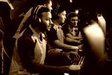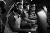 Group of multiethnic cybersport players in headsets sitting in front of computers and playing video games online indoors