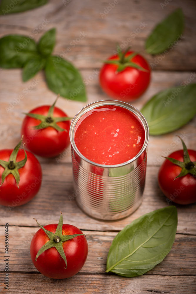 A canned tomatoes from above on wooden table