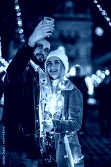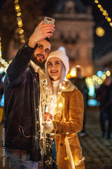 Happy smiling couple makes selfie at night Christmas street fair in European city. Winter holidays, vacation, travel, purchase conception. Copy, empty space for text