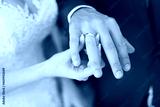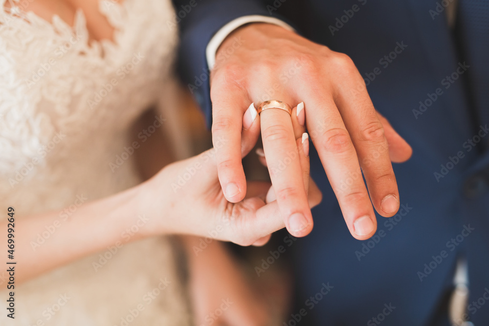 Bride and groom exchanging wedding rings. Stylish couple official ceremony