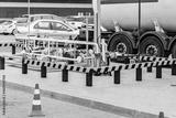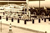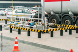 Natural gas station tubes and engines with yellow and black barrier around. Safety. Distribution. Control. Dangerously. Refill. Industry. Cistern. Supply