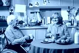 Senior man using wheelchair talking to his wife, she smiling and cutting bread at the table in the kitchen