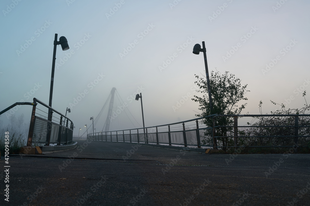 Der Herrenkrugsteg, eine Hängebrücke über den Fluss Elbe am Elberadweg bei Magdeburg im Nebel