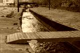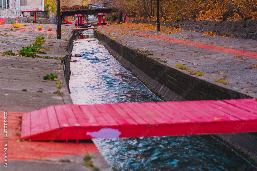 City's river inside a concrete construction with red wooden bridge for pedestrians. Public place. Urban
