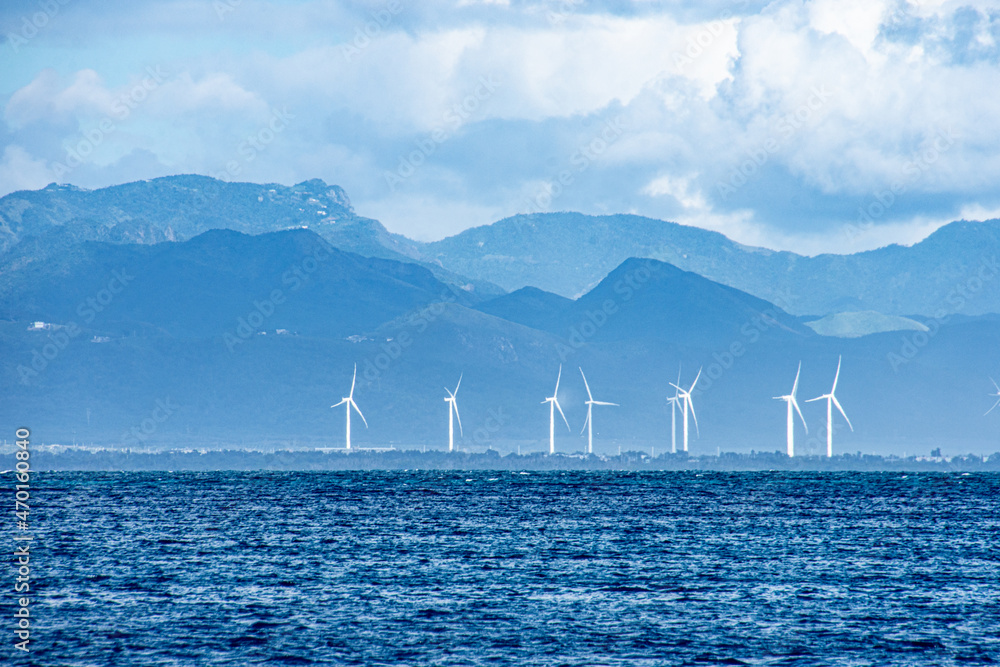 Dramatic view of white wind turbines on a background of blue mountains seen from the blue wave water of the Caribbean Sea. Puerto Rico, USA