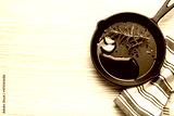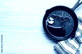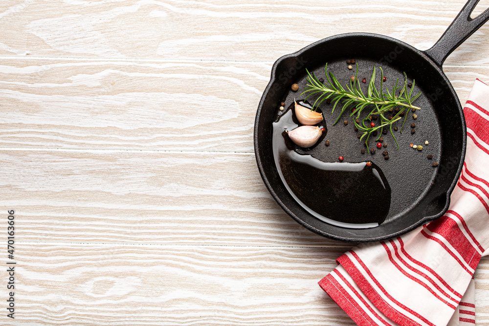 Black cast iron frying pan with ingredients for cooking: oil, fresh green rosemary, raw garlic cloves and colorful peppercorns on white wooden background flat lay top view with space for text