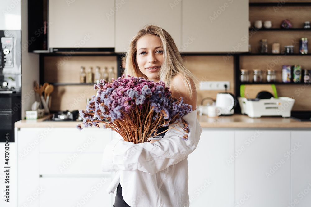 Carefree happy single young attractive woman dancing alone in modern kitchen interior, independent active lady having fun at clean home listening music enjoying freedom weekend time lifestyle at home