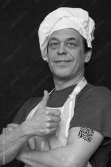 Studio portrait of an elderly man 45-50 years old with a tattooed QR code on his shoulder on a black background, a chef's hat and apron. Concept: hiring vaccinated, vaccinated food workers.