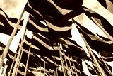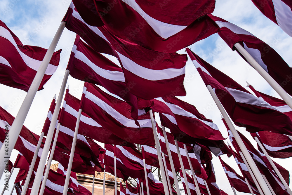 Lots of Latvian red and white flags on the day of proclamation of the Republic of Latvia. View from the bottom