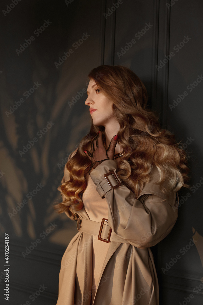 Gorgeous fashionable adult woman with a trendy hairstyle with curls in a stylish trench coat in a dark interior