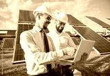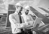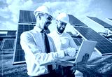 Engineer using laptop near photovoltaic panels producing renewable solar energy