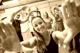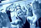 Hilarious young Caucasian dance teacher making frame with hands. Smiling instructor with long fair hair having fun with her senior group after class in studio. Dance, hobby, healthy lifestyle concept