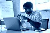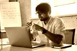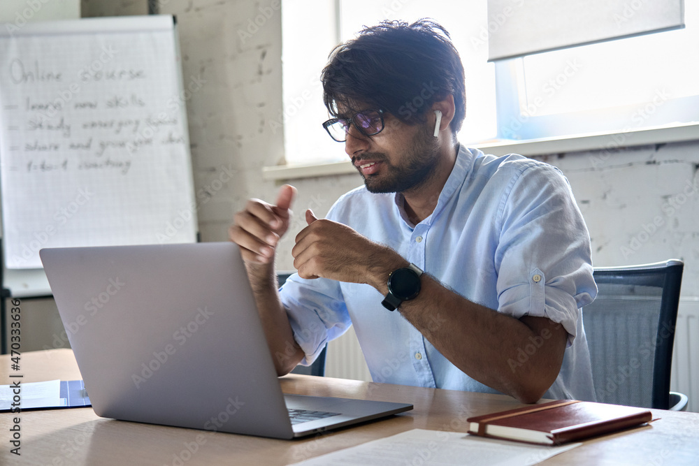 Indian corporate manager, teacher, coach leading virtual business training, remote class or work meeting conference online video call. Company leader having distant videoconference interview on laptop